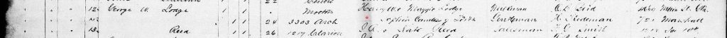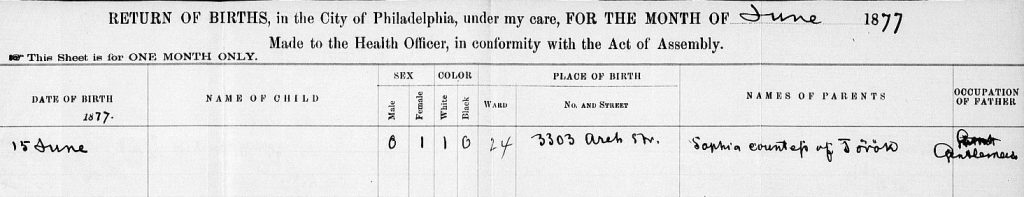 1. When registered [mikor lett bejegyezve]: 1877 December 31 – 2. Date of birth [születés napja]: June 15. [június 15., a szám itt nehezen kivehető] – 3. Name of child [gyermek neve]: … [üres, nincs sem kereszt-, sem vezetéknév] – 4. Sex [neme]: Female [nő] – 5. Color [színe]: White [fehér] – 6. Ward [kórterem]: 24 – 7. Place of birth, No. and street [születés helye, szám és utca]: 3303 Arch – 8. Names of parents [szülők nevei]: … [az apa keresztneve hiányzik] [&] Sophia Countess Török [grófnő Török Zsófia] – 9. Occupation of father [apa foglalkozása]: Gentleman12 [úr] – 10. Name of physician [orvos neve]: H. Tiedeman – 11. Residence of physician [orvos lakhelye]: 721 Marshall.